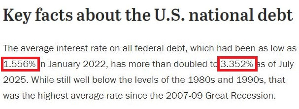 △美國皮尤研究中心的調(diào)查顯示,美聯(lián)邦債務(wù)的平均利率在美聯(lián)儲激進加息前的2022年1月曾低至1.556%,而到今年7月已翻了一倍多,達到3.352%,也是自2007-2009年大衰退以來的最高平均利率水平。