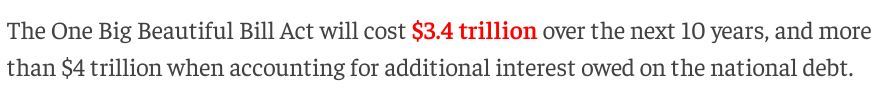 根據(jù)美國國會預(yù)算辦公室(CBO)上月做出的評估,“大而美”法案預(yù)計將在未來十年使美聯(lián)邦政府財政赤字增加約3.4萬億美元;如果算上同期的額外美債利息,新增赤字更是將超過4萬億美元。