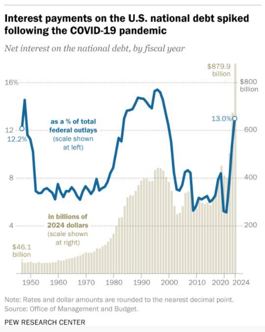 隨著債臺越筑越高,美國政府2024財年支付的凈債息已達到8799億美元,占當(dāng)年財政總支出的13%,不僅創(chuàng)下25年來的最高比例,而且超過了醫(yī)保支出(8741億美元)和軍費支出(8735億美元)。