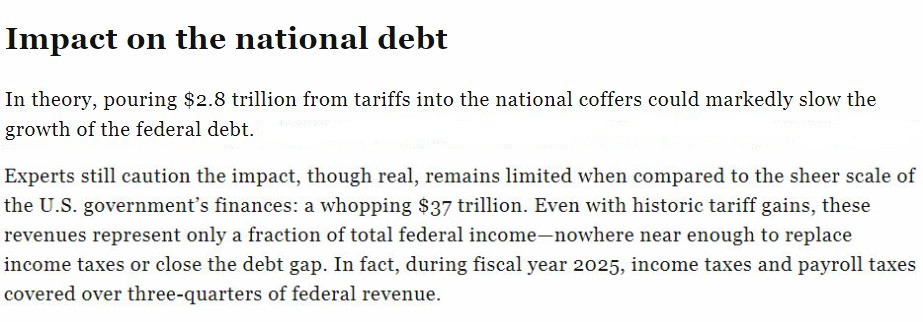 雖然美國政府確實從其濫施的關(guān)稅中“賺”了一筆,但專家們?nèi)匀痪嬷赋?,與37萬億美元的龐大美債規(guī)模相比,關(guān)稅收入實屬九牛一毛。即使加上歷史上的關(guān)稅收益,它們也只占聯(lián)邦總收入的一小部分,遠不足以取代所得稅或縮小債務(wù)缺口。