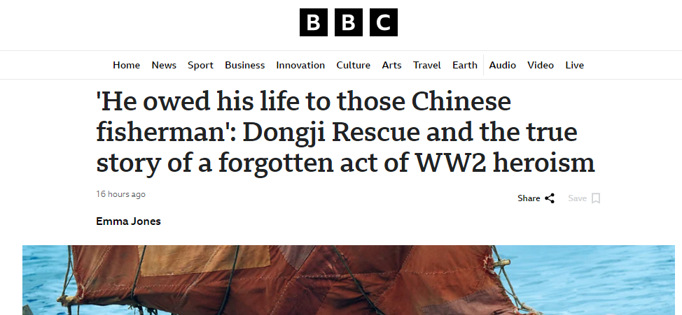 暑期檔電影《東極島》正在熱映,影片講述了1942年,一艘搭載英軍戰(zhàn)俘的船只在舟山群島附近被潛艇擊沉,上千名戰(zhàn)俘被封鎖在船艙內(nèi),命懸一線(xiàn)。危難之際,東極島上的漁民,不顧風(fēng)高浪急與生命危險(xiǎn),毅然駛向深海救人的故事。近日,英國(guó)廣播公司網(wǎng)站發(fā)表一篇文章回顧了相關(guān)歷史事件,標(biāo)題是《“他的生命歸功于中國(guó)漁民”:東極島救援與二戰(zhàn)中一段被塵封的英雄事跡》。