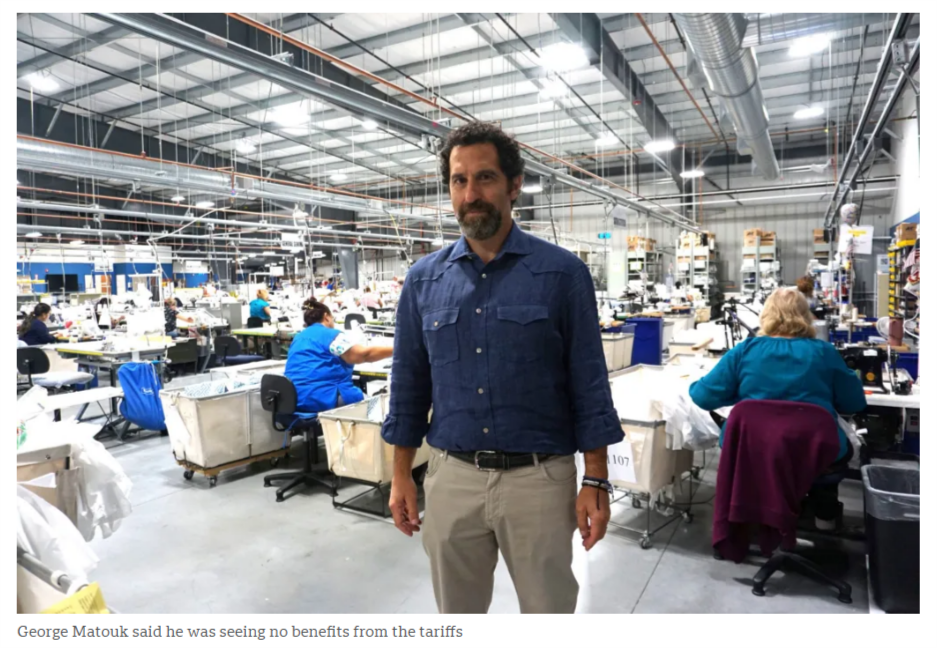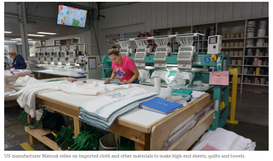 馬圖克表示,從今年4 月到 8 月,關(guān)稅導致其每月增加超過 10 萬美元的成本,因為高額關(guān)稅影響了來自印度和葡萄牙的棉布、來自列支敦士登的羽絨等原材料的供應。不僅如此,增加的成本還迫使企業(yè)削減了在新設(shè)備以及營銷方面的開支。喬治 馬圖克說,他“沒有從關(guān)稅中看到任何好處”。