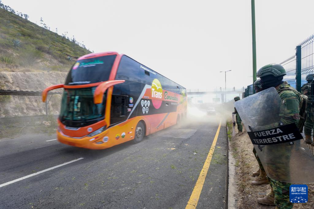 9月16日,在厄瓜多爾首都基多,武裝部隊(duì)人員在公路旁維持秩序。新華社發(fā)(里卡多·蘭德塔攝)
