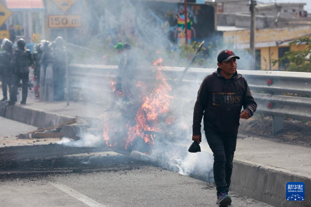 9月16日,在厄瓜多爾首都基多,一名路人經(jīng)過示威者點(diǎn)燃的路障。新華社發(fā)(里卡多·蘭德塔攝)