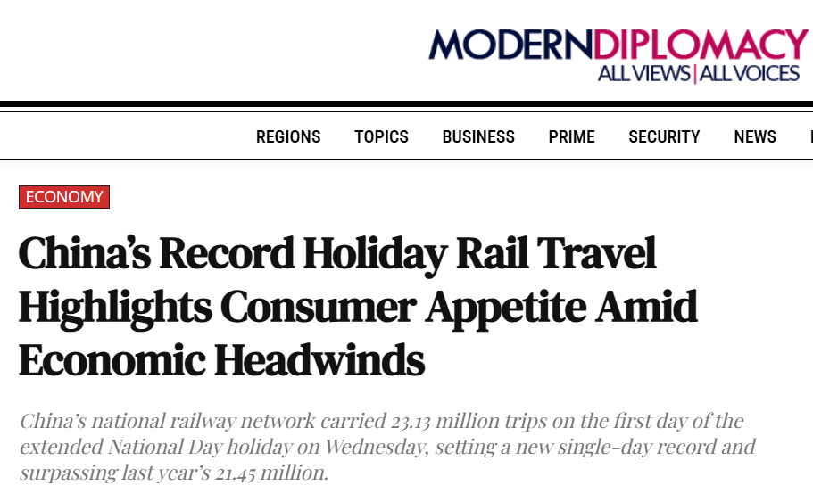 歐洲《現(xiàn)代外交》(Modern Diplomacy)網(wǎng)站報道注意到,中國國慶中秋“超長黃金周”首日,全國鐵路發(fā)送旅客2313萬人次,創(chuàng)下單日歷史新高。報道援引官方預測稱,整個八天假期出行總量預計將達23.6億人次,日均出行近3億人,堪稱“史上最忙假期”。