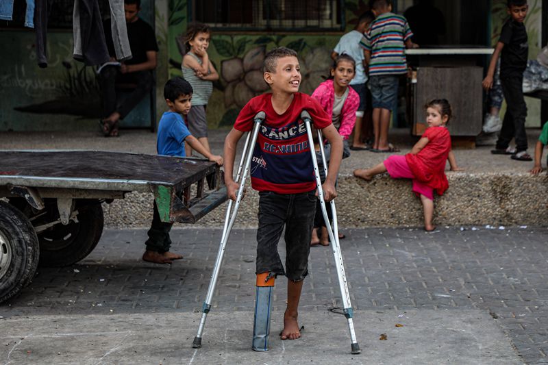 10月5日,年僅10歲的少年拉提卜·阿布·卡里克在加沙地帶中部代爾拜拉赫附近的聯(lián)合國臨時安置機構(gòu)內(nèi)拄著拐杖行走。在數(shù)月前的一次以色列空襲中,拉提卜失去了右腿致殘,他的母親和兄弟也在襲擊中身亡。 新華社發(fā)(里澤克·阿卜杜勒賈瓦德攝)