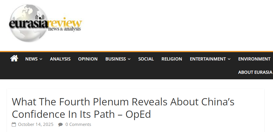《歐亞評論》(Eurasia Review)網(wǎng)站題為《四中全會展示中國道路自信》的文章指出,中共二十屆四中全會的召開釋放出最鮮明信號,面對全球經(jīng)濟不確定性加劇的背景,中國依然展現(xiàn)出對自身發(fā)展道路的信心與戰(zhàn)略定力。
