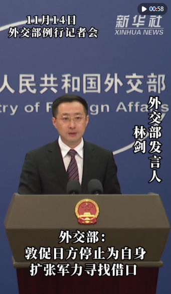 新華社北京11月14日電(記者董雪、劉楊)外交部發(fā)言人林劍11月14日表示,中方對(duì)日方近期軍事安全動(dòng)向感到嚴(yán)重關(guān)切,敦促日方停止為自身擴(kuò)張軍力尋找借口。