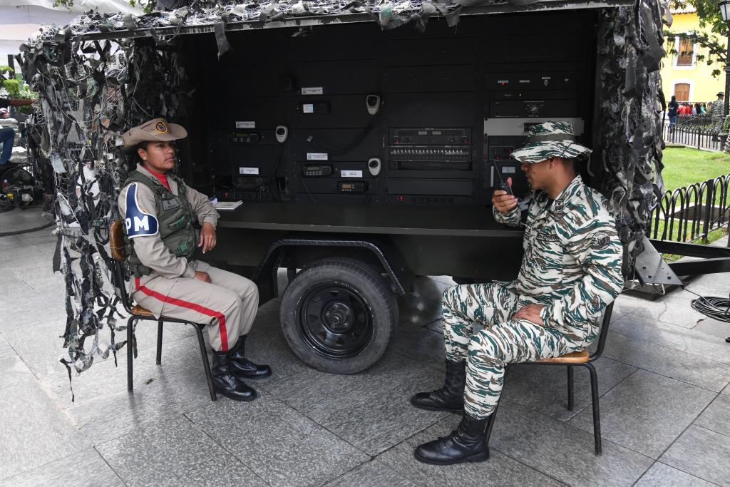 10月4日,在委內(nèi)瑞拉首都加拉加斯的玻利瓦爾廣場,玻利瓦爾民兵組織成員操作通信設備。新華社發(fā)(馬科斯·薩爾加多攝)
