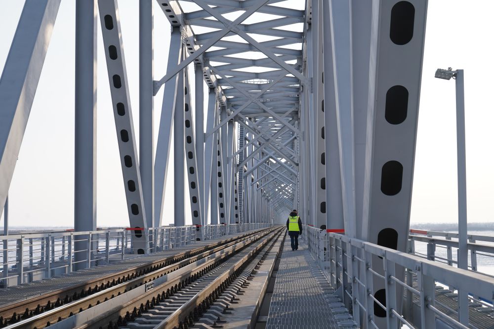 12月6日,在俄羅斯猶太自治州下列寧斯闊耶,俄方人員在跨越阿穆爾河(黑龍江)的同江-下列寧斯闊耶鐵路大橋上巡視。新華社記者 劉愷 攝