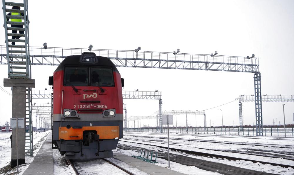 12月6日,一輛即將開往中國的俄羅斯貨運列車停靠在俄羅斯下列寧斯闊耶鐵路口岸。新華社記者 劉愷 攝