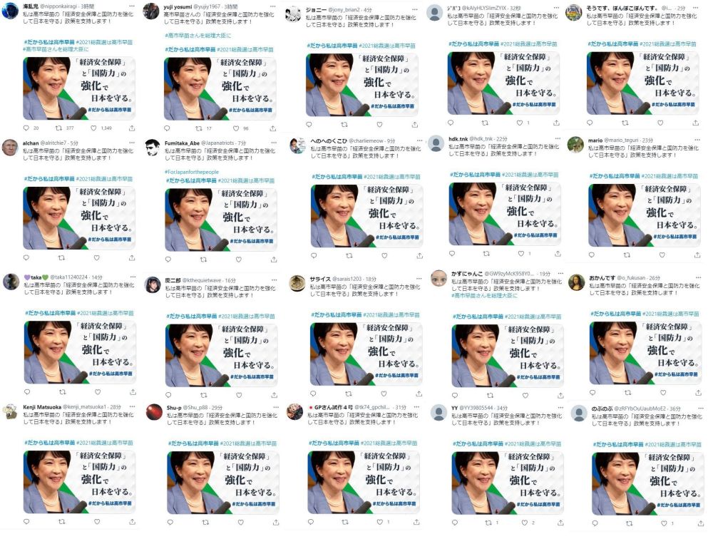 日本社交媒體平臺充斥如“當然只能支持高市早苗”“高市早苗拜托了”等內容相似的帖文。