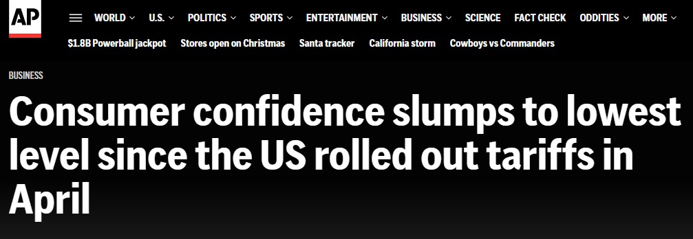 報(bào)道稱,根據(jù)調(diào)查給出的書(shū)面回復(fù),盡管美國(guó)政府一再聲稱通脹是騙局,但物價(jià)上漲和通脹加劇,連同關(guān)稅問(wèn)題,仍然是消費(fèi)者最大的擔(dān)憂。美國(guó)消費(fèi)者對(duì)當(dāng)前經(jīng)濟(jì)狀況的評(píng)估暴跌9.5點(diǎn)至116.8。