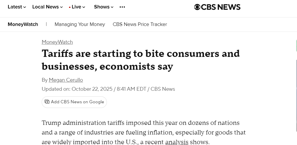 哥倫比亞廣播公司(CBS)新聞網(wǎng)今年10月的報(bào)道也指出,美國政府實(shí)施的關(guān)稅開始“咬噬”消費(fèi)者和企業(yè)。經(jīng)濟(jì)學(xué)家指出,關(guān)稅正在推高通脹,尤其是對大量進(jìn)口的商品而言。進(jìn)口商通常會將部分關(guān)稅成本轉(zhuǎn)嫁給消費(fèi)者。今年關(guān)稅預(yù)計(jì)將給美國企業(yè)額外增加1.2萬億美元成本,其中大部分由消費(fèi)者承擔(dān)。