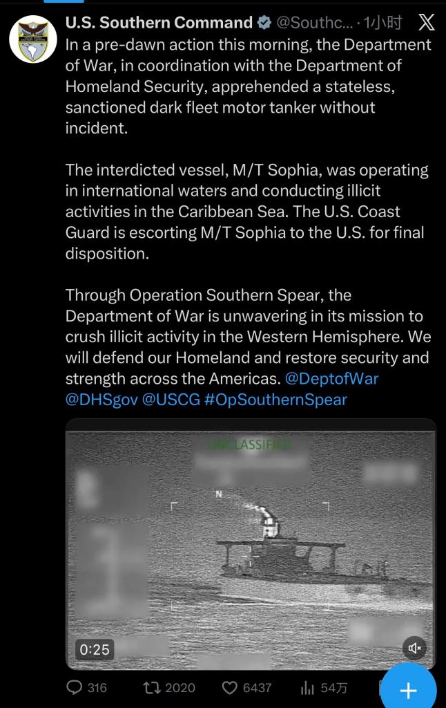 此外,美國南方司令部7日在社交媒體發(fā)布消息稱,美國當(dāng)天凌晨攔截“一艘無國籍、受制裁的‘影子艦隊’油輪”,行動過程中未發(fā)生任何意外。該船名為“索菲亞”號,當(dāng)時正在國際水域航行。美國海岸警衛(wèi)隊正在控制“索菲亞”號前往美國進行處置。據(jù)路透社消息,這艘船1月早些時候從委內(nèi)瑞拉駛離。(記者:馬驍、湯潔峰)
