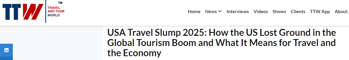國際旅游行業(yè)媒體《旅行與旅游世界》網(wǎng)站也在報道中提到,美國旅游業(yè)2025年呈現(xiàn)出了與全球旅游業(yè)蓬勃發(fā)展截然相反的態(tài)勢——入境游客數(shù)量減少、旅游消費額下滑,這一局面給美國旅游行業(yè)乃至整體經(jīng)濟帶來巨大沖擊。