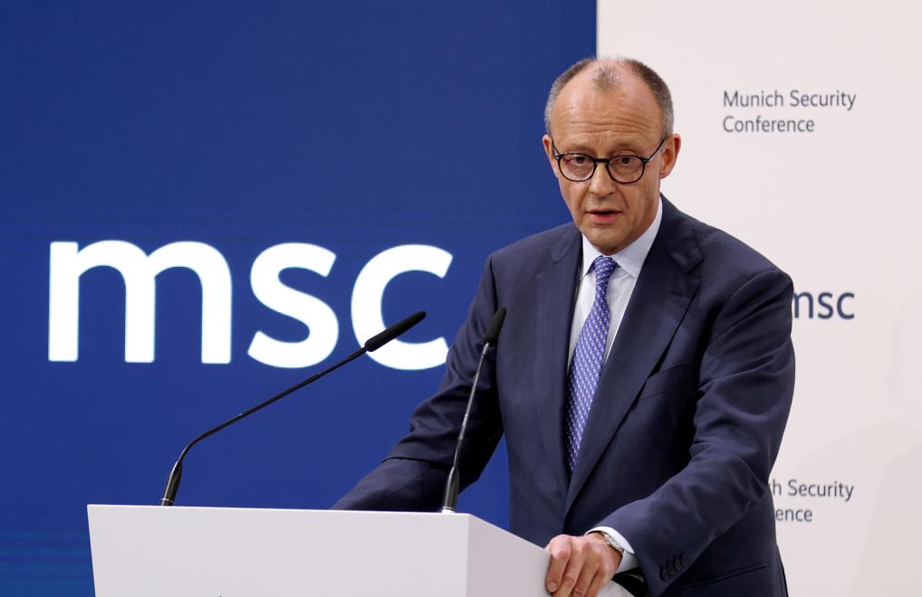 2月13日,在德國慕尼黑,德國總理默茨在第62屆慕尼黑安全會議開幕式上致辭。新華社記者李穎攝