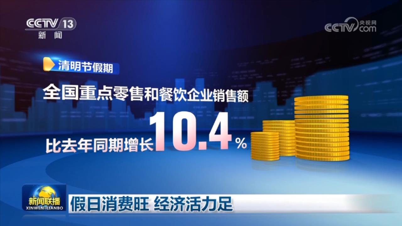 商務(wù)部商務(wù)大數(shù)據(jù)監(jiān)測顯示,清明節(jié)假期,全國重點零售和餐飲企業(yè)銷售額比去年同期增長10.4%。商品消費方面,綠色有機食品、服裝、家電、通訊器材等銷售額同比增長都超過10%,全國示范步行街客流量和銷售額同比增長也都超過五成。