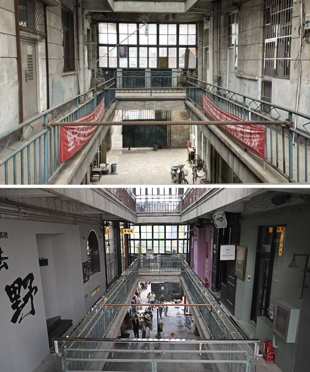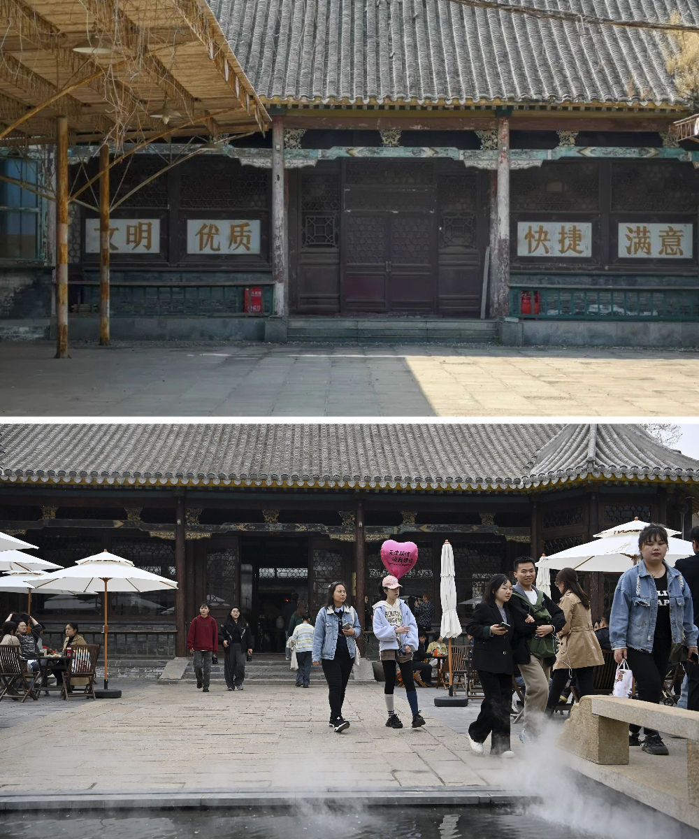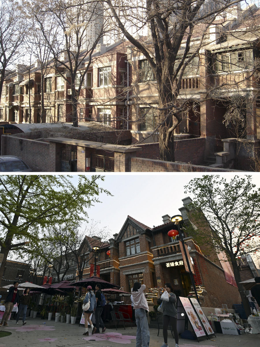 拼版照片:上圖是改造前的先農(nóng)大院(資料照片)。下圖是游客在位于五大道的先農(nóng)大院內(nèi)游覽(4月6日攝)。始建于1925年的先農(nóng)大院是五大道建成最早的建筑群之一,融合了英式聯(lián)排住宅、英式獨(dú)棟別墅等多種特色的建筑風(fēng)格。歲月變遷,這些建筑一度損壞嚴(yán)重,配套設(shè)施老化。2006年起,天津啟動(dòng)先農(nóng)大院整理項(xiàng)目,對(duì)街區(qū)居民進(jìn)行了騰遷,對(duì)建筑進(jìn)行了加固修繕,恢復(fù)了街區(qū)的歷史原貌,引進(jìn)了餐飲、文化展示、辦公等業(yè)態(tài),使這里形成了環(huán)境優(yōu)雅的公共藝術(shù)和展示建筑遺產(chǎn)的城市新空間。