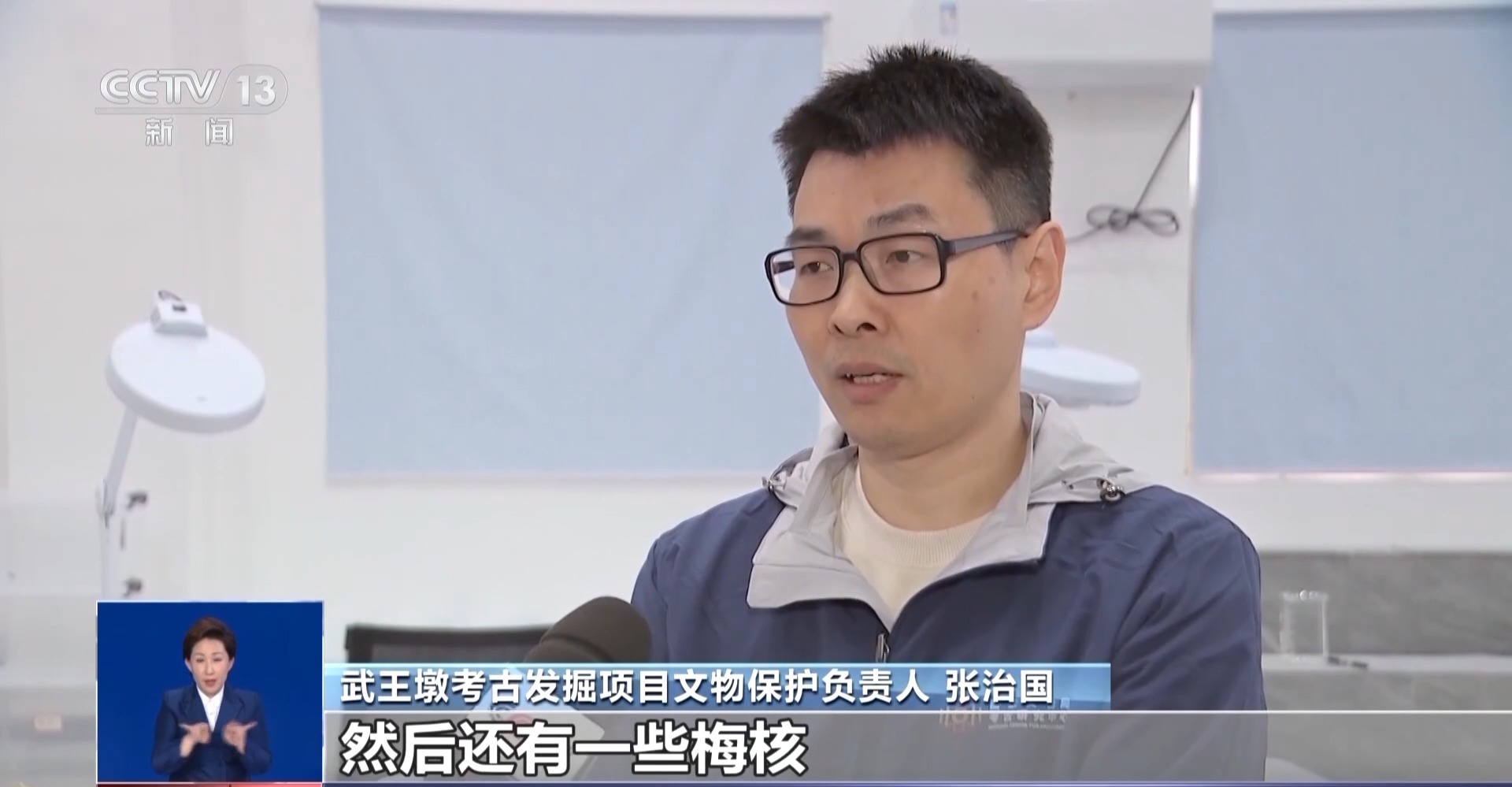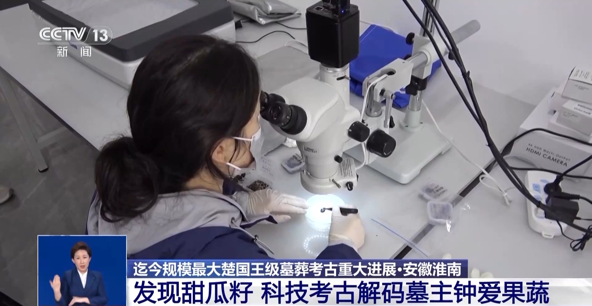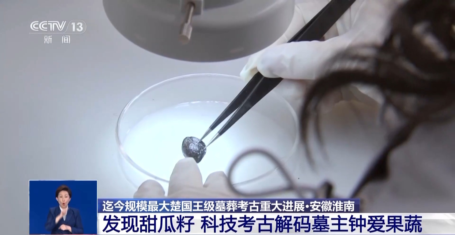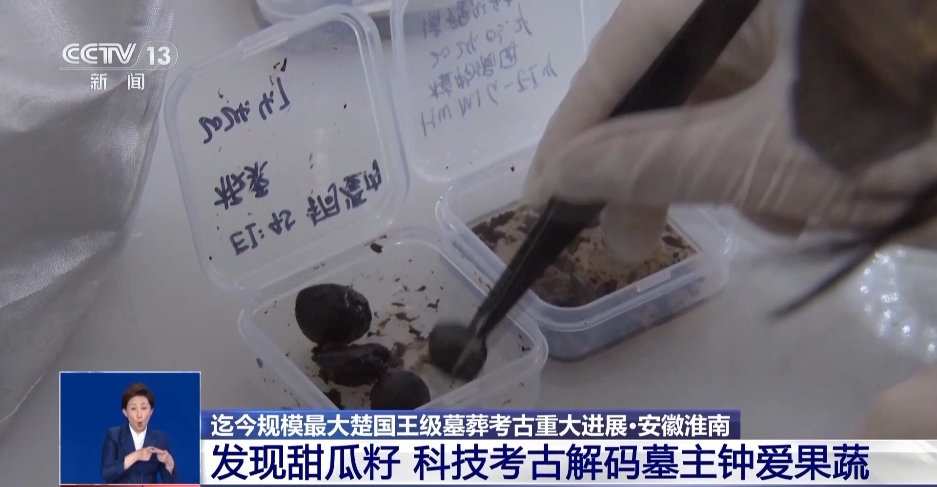 武王墩考古發(fā)掘項(xiàng)目文物保護(hù)負(fù)責(zé)人 張治國(guó):發(fā)現(xiàn)大部分的這個(gè)里面都是一些樹葉,然后還有果核,可能還有一些草編的痕跡,目前初步鑒定出來(lái)的有甜瓜籽,然后還有一些梅核。