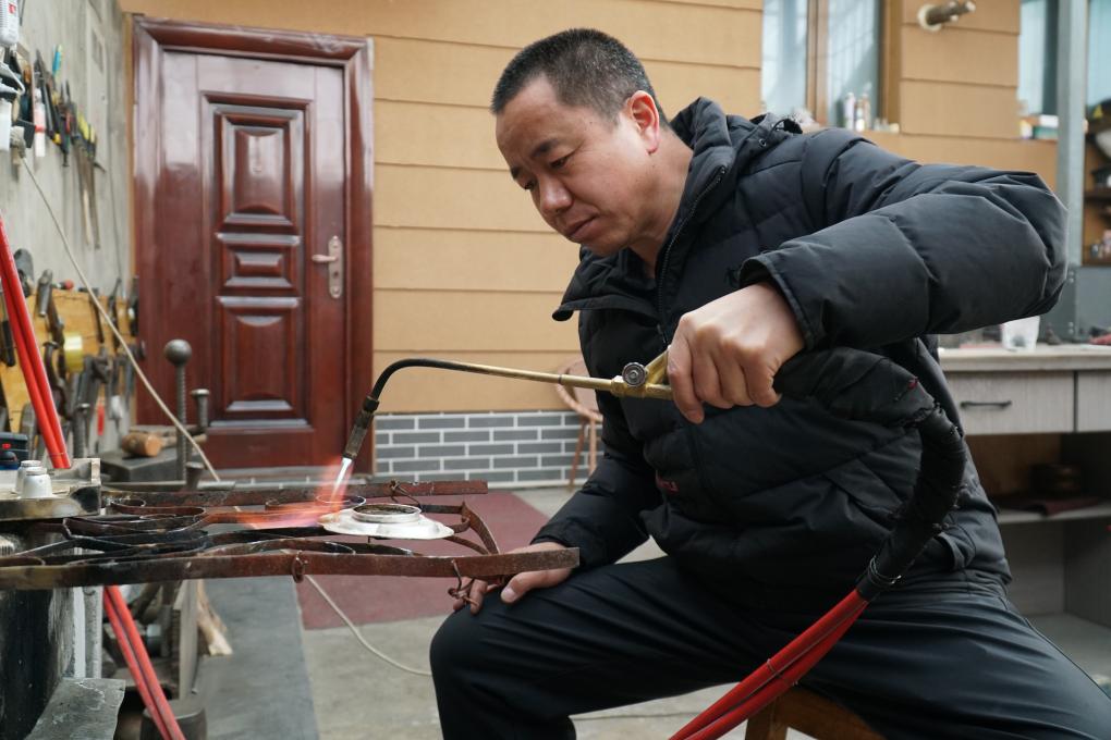 王富邦居住的青海省西寧市湟中區(qū)魯沙爾鎮(zhèn)陽坡村,是湟中“銀銅器制作及鎏金技藝”發(fā)祥地。100多年前,這里因緊鄰藏傳佛教名寺塔爾寺而成為銀銅器匠人的聚居地。王富邦介紹說:“一開始只是外來的漢族匠人鍛造宗教器物,后來本地的漢、藏、土族群眾也加入進(jìn)來,村莊因‘家家有作坊’而逐漸揚名?!?/p>