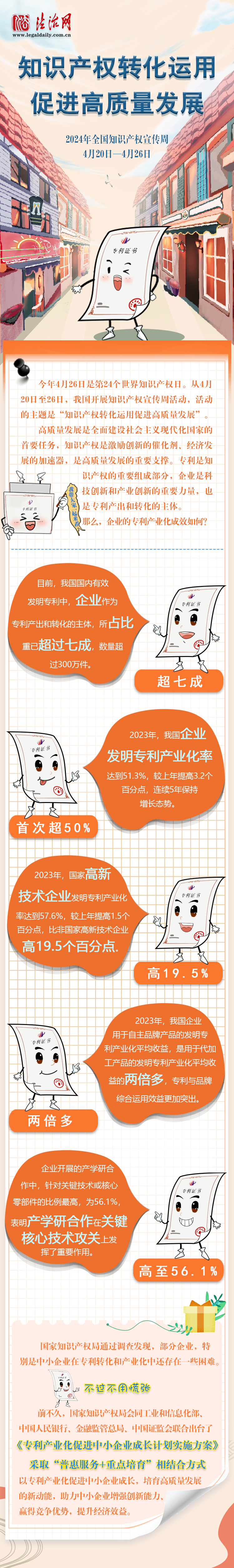 今年4月26日是第24個世界知識產(chǎn)權(quán)日。4月20日至26日,我國開展知識產(chǎn)權(quán)宣傳周活動,主題是“知識產(chǎn)權(quán)轉(zhuǎn)化運用促進高質(zhì)量發(fā)展”。