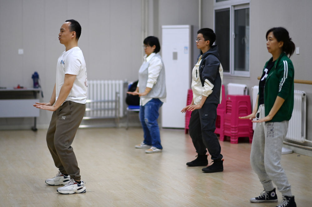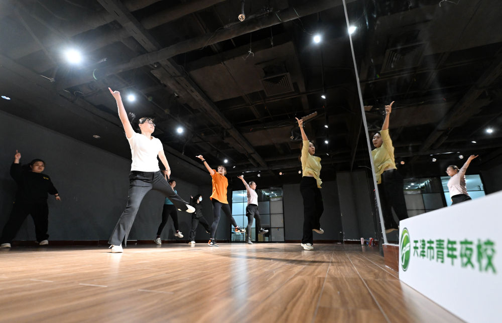 ↑4月26日,在天津青年宮,學員在青年夜校民族舞課上練習。