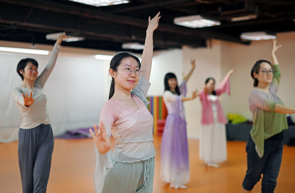 ↑4月23日,在天津青年宮,學員呂昕蕾(前)等在青年夜校民族舞課上練習。