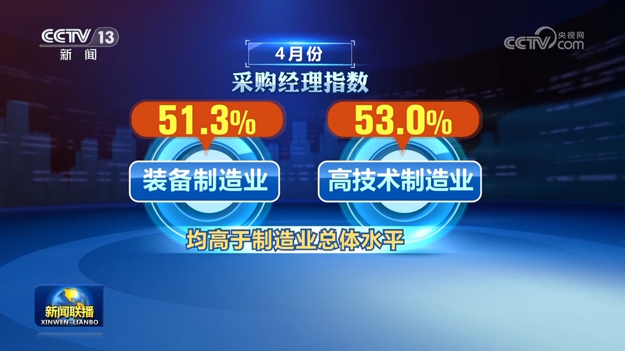 新動(dòng)能繼續(xù)較快擴(kuò)張。4月份裝備制造業(yè)和高技術(shù)制造業(yè)采購(gòu)經(jīng)理指數(shù)分別為51.3%和53.0%,均高于制造業(yè)總體水平。