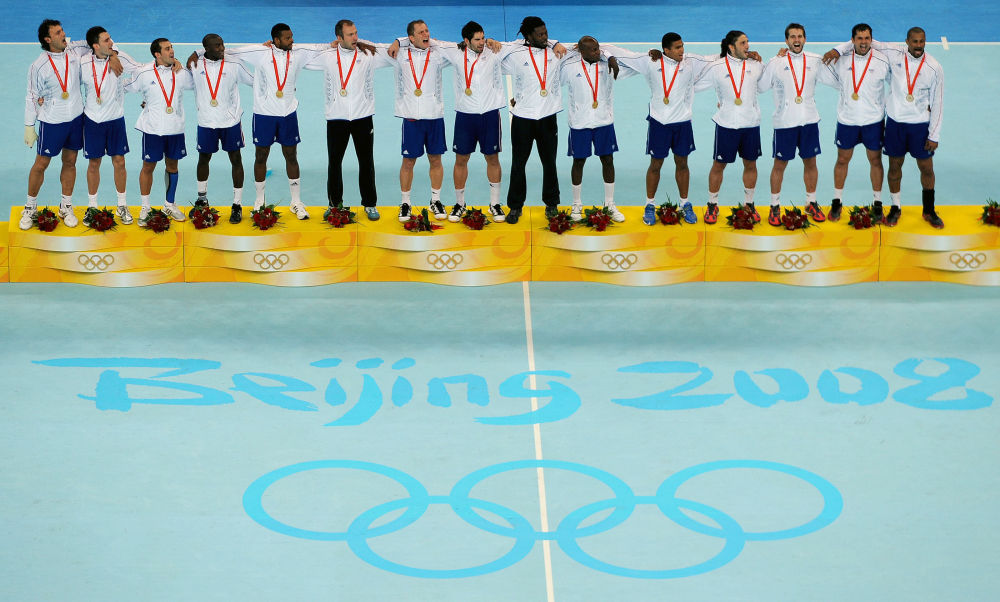 ↑2008年8月24日,法國隊球員在北京奧運會男子手球冠軍領(lǐng)獎臺上高唱國歌。