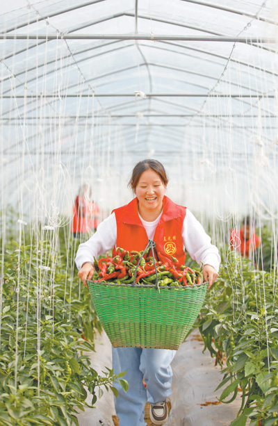 福建省南安市金淘鎮(zhèn)的蔬菜基地內(nèi),晨光村網(wǎng)格員幫助農(nóng)戶搬運(yùn)采摘下的辣椒。 謝貴明攝(影像中國(guó))