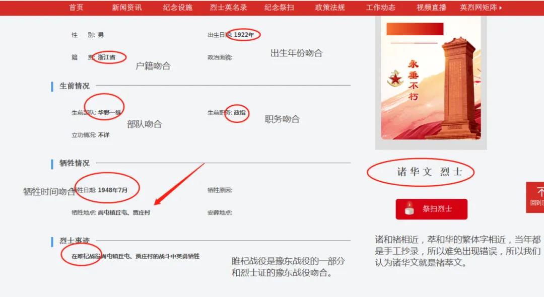 基本信息中,諸華文的出生年份、戶籍、生前情況和犧牲情況都與褚萃文吻合;姓名方面,“諸”與“褚”偏旁相似,而華的繁體寫(xiě)法(華)與萃也有些相似,可能是登記時(shí)出現(xiàn)了錯(cuò)誤。