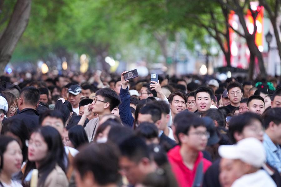 5月1日,哈爾濱中央大街上人頭攢動(dòng)?!拔逡弧奔倨?,文旅市場(chǎng)火熱。新華社記者 王建威 攝