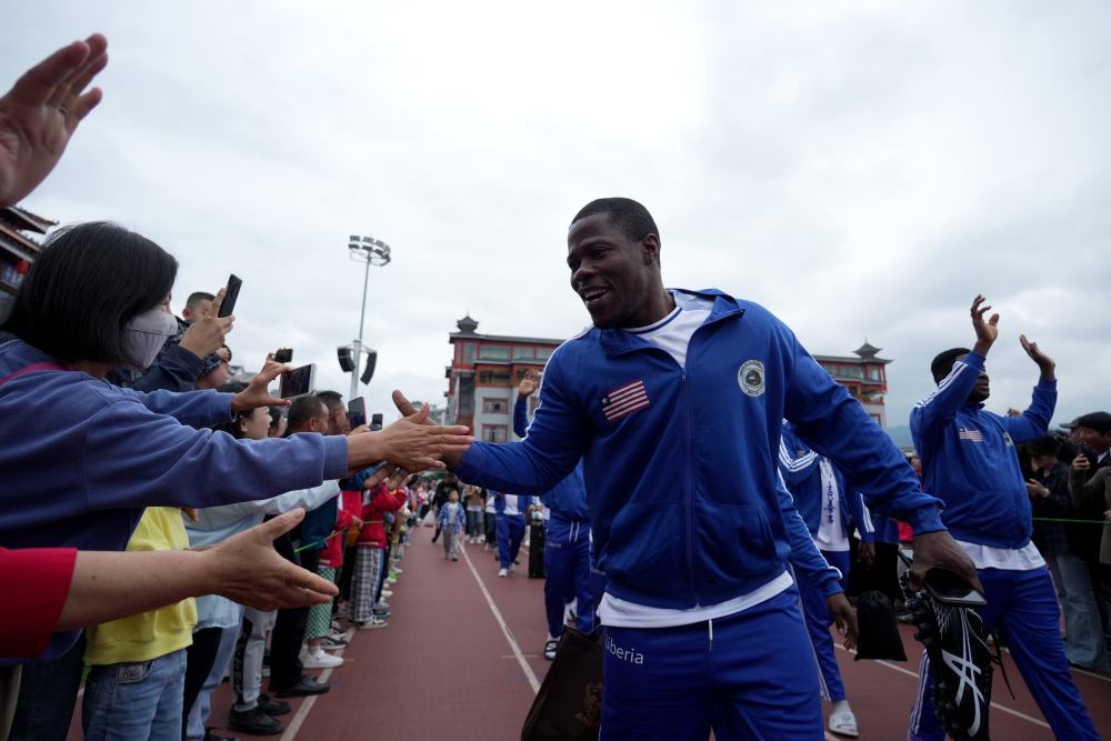 5月1日,貴州省黔東南苗族侗族自治州榕江縣“村超”球場(chǎng),來自非洲利比里亞社聯(lián)足球隊(duì)球員與群眾互動(dòng)。新華社發(fā)(王炳真 攝)