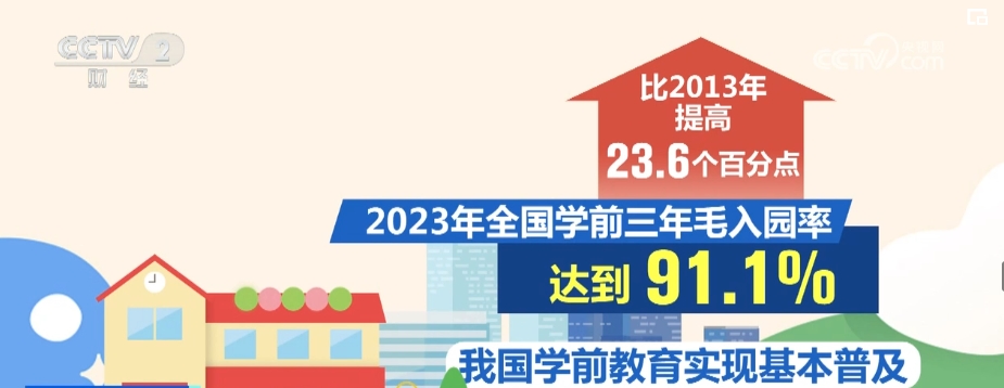 據(jù)介紹,截至2023年,全國(guó)幼兒園數(shù)量達(dá)到27.4萬所,2023年全國(guó)學(xué)前三年毛入園率達(dá)到91.1%,比2013年提高了23.6個(gè)百分點(diǎn),我國(guó)學(xué)前教育實(shí)現(xiàn)基本普及。