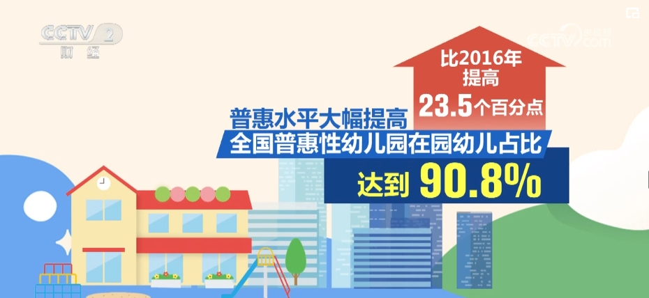 2011年—2023年,中央財(cái)政支持學(xué)前教育發(fā)展專項(xiàng)資金累計(jì)投入2210億元。普惠水平大幅提高,全國(guó)普惠性幼兒園在園幼兒占比達(dá)到90.8%,比2016年提高23.5個(gè)百分點(diǎn),絕大多數(shù)幼兒都能在收費(fèi)合理的普惠性幼兒園就讀。
