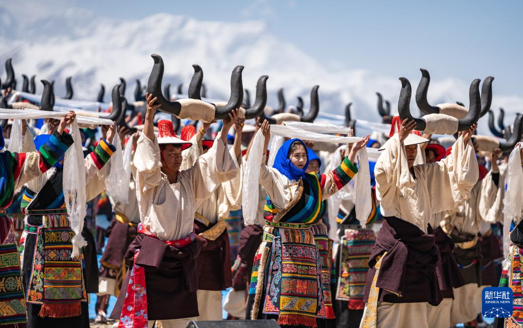 舞蹈演員在納木錯(cuò)開(kāi)湖活動(dòng)現(xiàn)場(chǎng)表演(5月19日攝)。