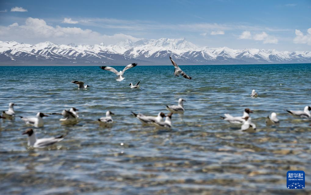 一群棕頭鷗在冰雪消融的納木錯(cuò)湖面停留(5月19日攝)。