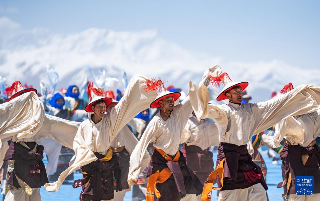 舞蹈演員正在納木錯(cuò)開(kāi)湖活動(dòng)現(xiàn)場(chǎng)表演(5月19日攝)。