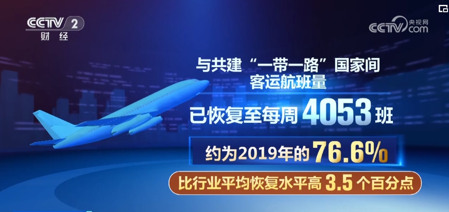 與共建“一帶一路”國家間客運(yùn)航班量已恢復(fù)至每周4053班,約為2019年的76.6%,比行業(yè)平均恢復(fù)水平高3.5個(gè)百分點(diǎn)。