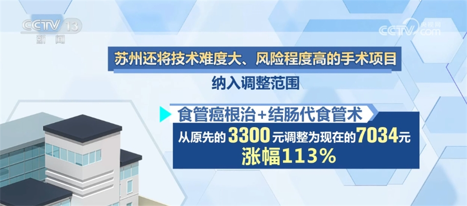 除了推進醫(yī)療機構分級定價,蘇州市醫(yī)療服務價格改革對一些歷史價格長期偏低,不能體現(xiàn)技術勞務價值的項目進行調(diào)整。如骨髓活檢術的醫(yī)療服務價格由過去的65元調(diào)整為124元,漲幅91%;斷指再植術由過去的1800元調(diào)整為3275元,漲幅82%。此外,蘇州還將技術難度大、風險程度高的手術項目納入調(diào)整范圍,調(diào)整的手術項目占比約60%,并對四級手術優(yōu)先調(diào)整,共調(diào)整四級手術項目110項,占比約13%。如食管癌根治+結腸代食管術,從原先的3300元調(diào)整為現(xiàn)在的7034元,漲幅113%。調(diào)整后,醫(yī)保仍按甲類項目全額報銷,上漲費用全部由醫(yī)保基金支付,患者的個人負擔沒有增加多少。
