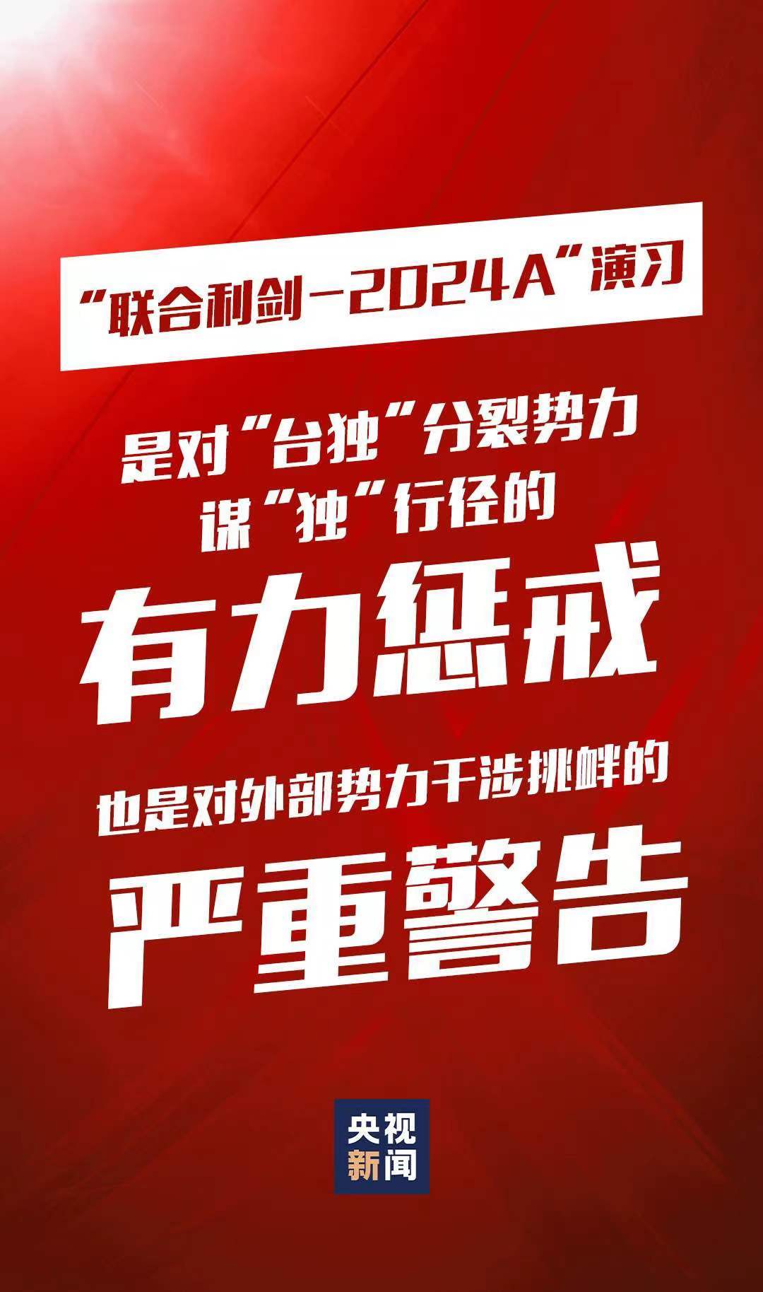 5月23日至24日,中國人民解放軍東部戰(zhàn)區(qū)組織戰(zhàn)區(qū)陸軍、海軍、空軍、火箭軍等兵力,位臺島周邊開展“聯(lián)合利劍-2024A”演習,重點演練聯(lián)合??諔?zhàn)備警巡、聯(lián)合奪取戰(zhàn)場綜合控制權、聯(lián)合精打要害目標等科目,艦機抵近臺島周邊戰(zhàn)巡,島鏈內外一體聯(lián)動,檢驗戰(zhàn)區(qū)部隊聯(lián)合作戰(zhàn)實戰(zhàn)能力。這是中國維護國家主權和領土完整的正義之舉,也是對“臺獨”分裂勢力謀“獨”行徑的有力懲戒,對外部勢力干涉挑釁的嚴重警告。