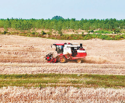 一片金黃的麥田里,撥禾輪轉(zhuǎn)動,麥芒飛揚,麥粒傾瀉而下……就在23日,蔡華從早忙到晚,沒敢停歇:“預(yù)報有雨,我得趕緊把客戶家的80多畝地收完?!碧烊谙聛?,他才把收割機停進(jìn)車棚,麥香味瞬間涌進(jìn)小院。累了一整天,剛吃完飯,蔡華又和妻子張秀蘭盤算起出發(fā)的行頭:對講機、收款二維碼……