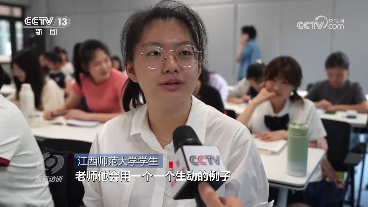 江西師范大學學生:“老師他會用一個生動的例子來表達他的觀點,然后也會用一些讓人感覺很熱血沸騰的,也有那種催人眼淚的故事,然后來激蕩我的心靈。”