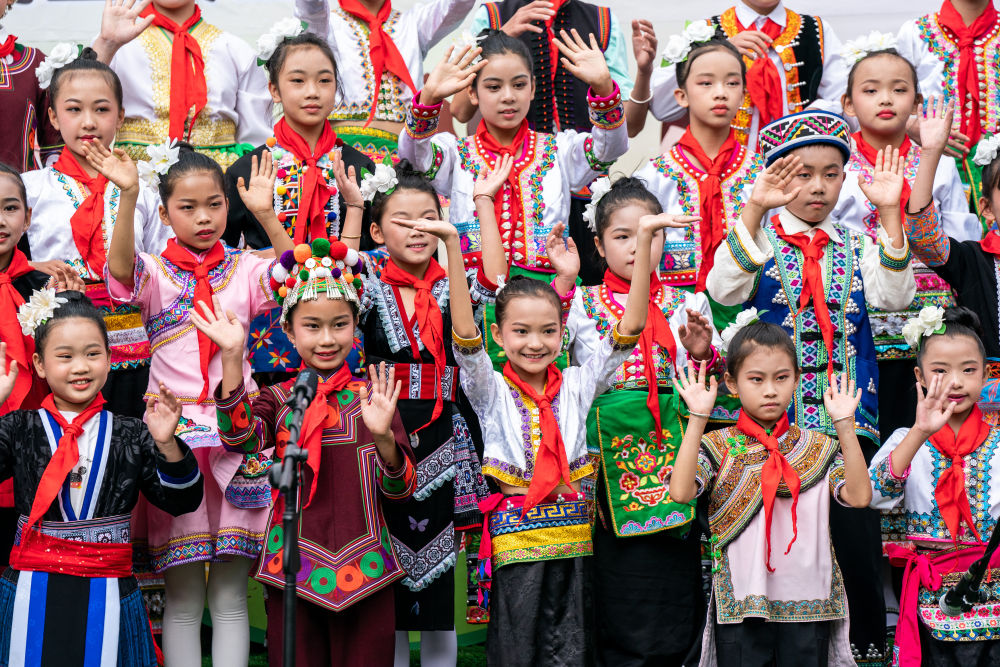 “咿唔瑟,咿唔瑟,吸噶拉羅,哈賽賽,賽哩羅作搓……”(歌詞大意為:巧遇大家來唱歌喲)視頻連線的另一邊,隨著哈尼族兒歌《阿密策》響起,38名身著苗、瑤、傣、哈尼族等民族服飾的同學們,將歡快的歌聲獻給“奧比昂爺爺”。
