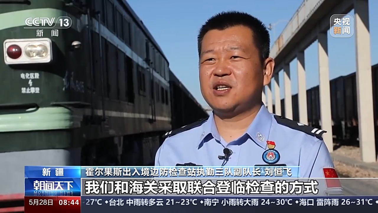 霍爾果斯出入境邊防檢查站執(zhí)勤三隊副隊長 劉恒飛:我們和海關(guān)采取聯(lián)合登臨檢查的方式對班列車體進行檢查,查驗出入境司乘人員和貨物基本是同步進行,30分鐘內(nèi)即可完成查驗。