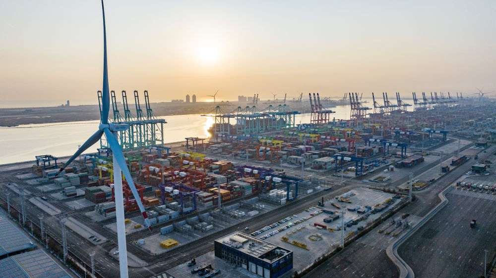 看似平常的碼頭作業(yè),背后卻另有玄機(jī)——整個(gè)過程達(dá)到了“零碳”排放。2021年底,隨著兩臺風(fēng)機(jī)葉片緩緩啟動,這座全球首個(gè)“智慧零碳”碼頭的智慧綠色能源系統(tǒng)開始并網(wǎng)發(fā)電,通過風(fēng)電、光伏發(fā)出的綠色能源,源源不斷為碼頭生產(chǎn)提供能源。