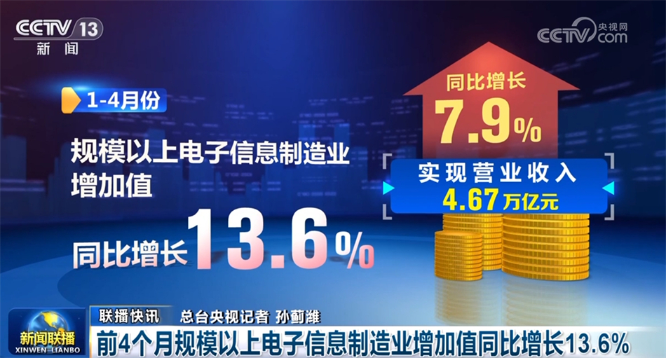 前4個(gè)月規(guī)模以上電子信息制造業(yè)增加值同比增長(zhǎng)13.6%