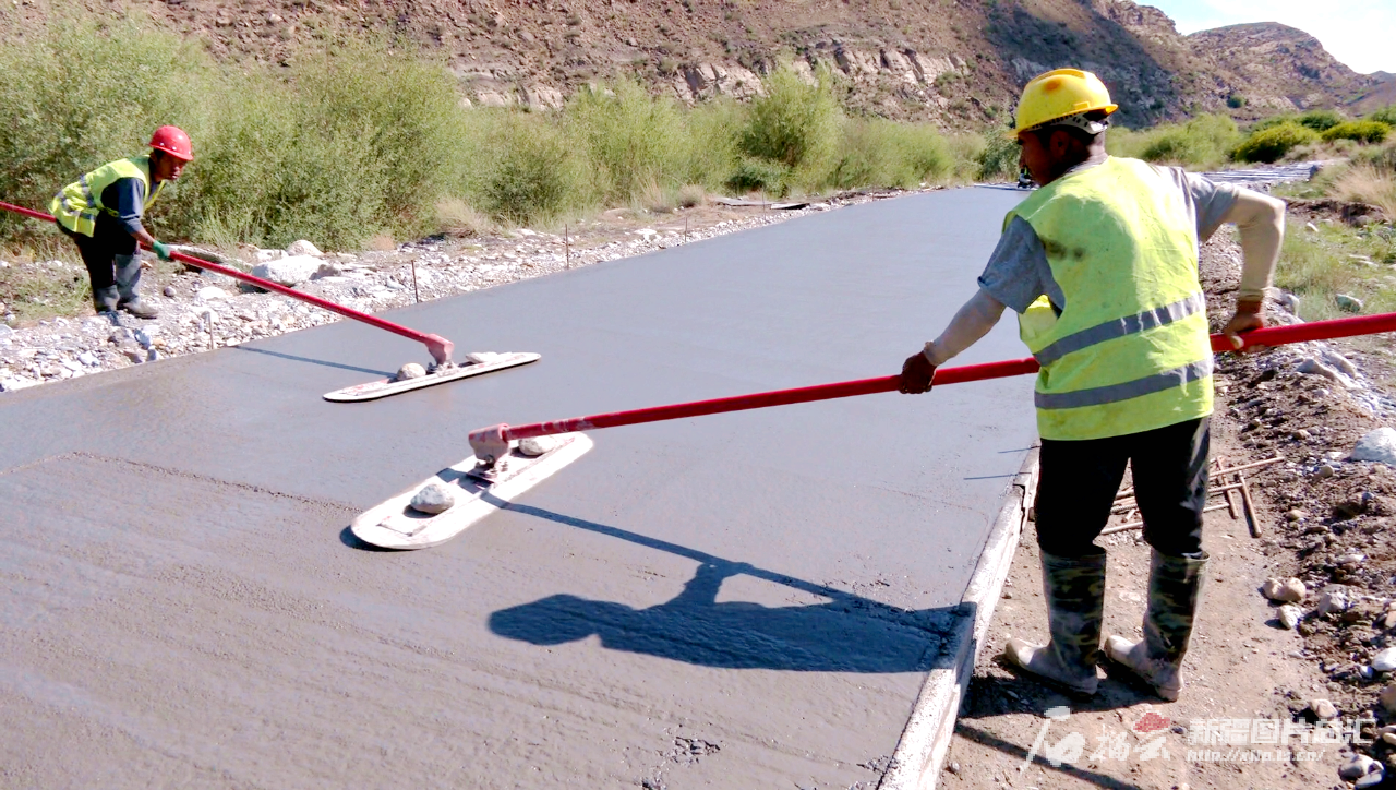 拜城縣鐵熱克鎮(zhèn)農(nóng)村公路建設現(xiàn)場,工人們抹平路基上的混凝土。魏百寧攝