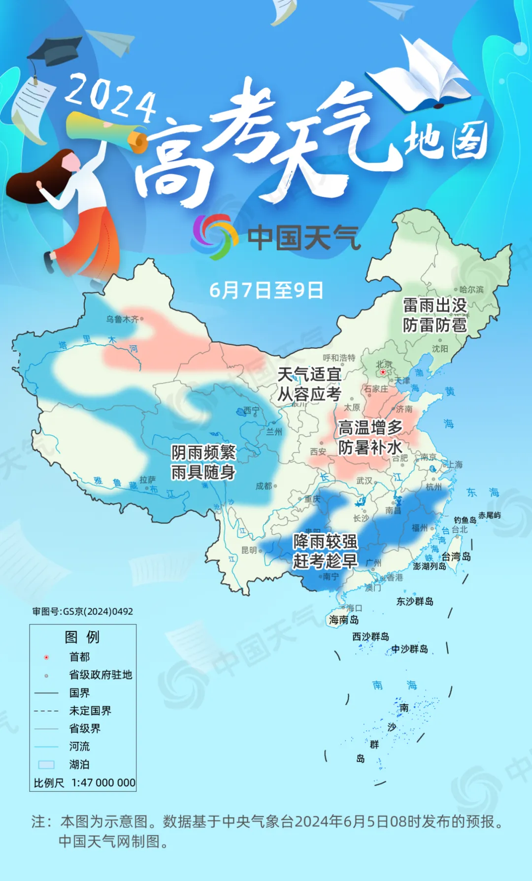 中央氣象臺預(yù)計,高考和端午假日期間(6月7日至10日),南方地區(qū)有較強降雨天氣過程。西南地區(qū)東部和南部、江南中南部、華南有中到大雨,云南、貴州、廣西、廣東、湖南、江西、福建等地部分地區(qū)有暴雨或大暴雨;上述部分地區(qū)伴有短時強降水或雷暴大風(fēng)等強對流天氣。